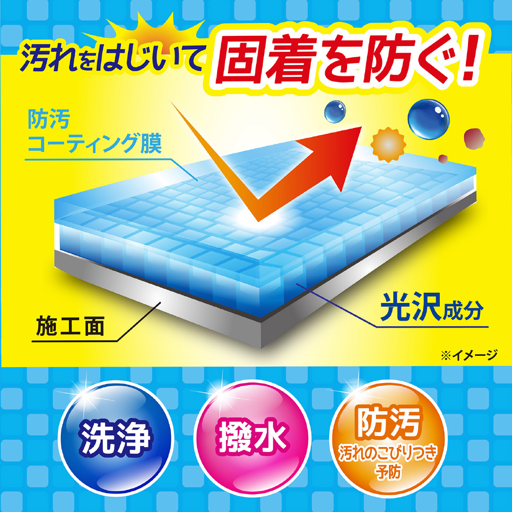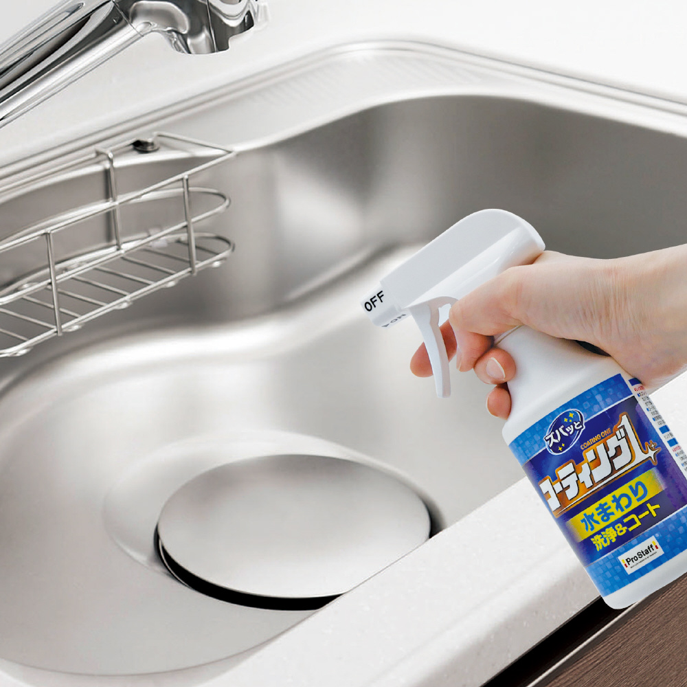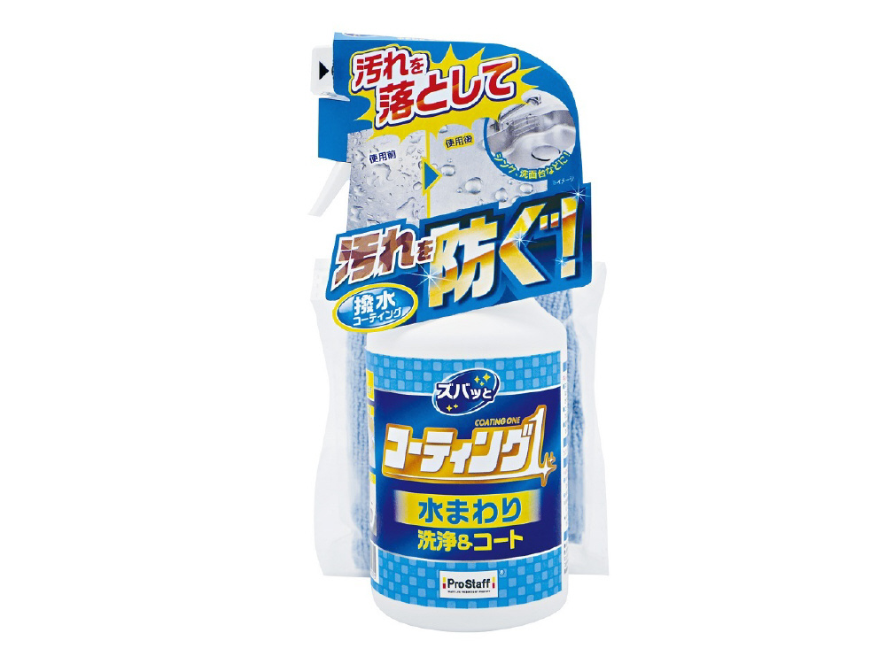 水まわりの洗浄&防汚コーティングができるスプレータイプのコーティング剤です。 キッチンのシンクや洗面台に付着した汚れ・水アカを、洗浄液とマイクロファイバークロスの相乗効果でズバッと落とし、同時に撥水コーティング被膜を形成します。 水がサッと流れる撥水&保護効果で、水アカ・ヌメリ・カビが付着しにくくなり、さらにはピカッと輝くツヤ出し効果を与えます。次回のお掃除もラクになりキレイが長続きします。 気になった時にシュッとスプレーして使える、お掃除のマストアイテムです。