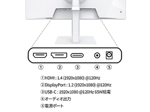 ■インターフェイスは、HDMI 1.4 x1 (120Hz)、DisplayPort 1.2 x 1 (120Hz)とUSB-C x1 (120Hz/最大65W給電)を搭載し、様々な機器との接続が可能です。USB-C(最大65W給電)は、対応のPCであればUSB-Cケーブル1本でモニターへの映像出力とノートPCへの給電が可能。ケーブル1本でスッキリ接続出来るだけでなく、テレワーク、出社併用の場合などノートPCのACアダプターを持ち運ぶ必要が無くなります。