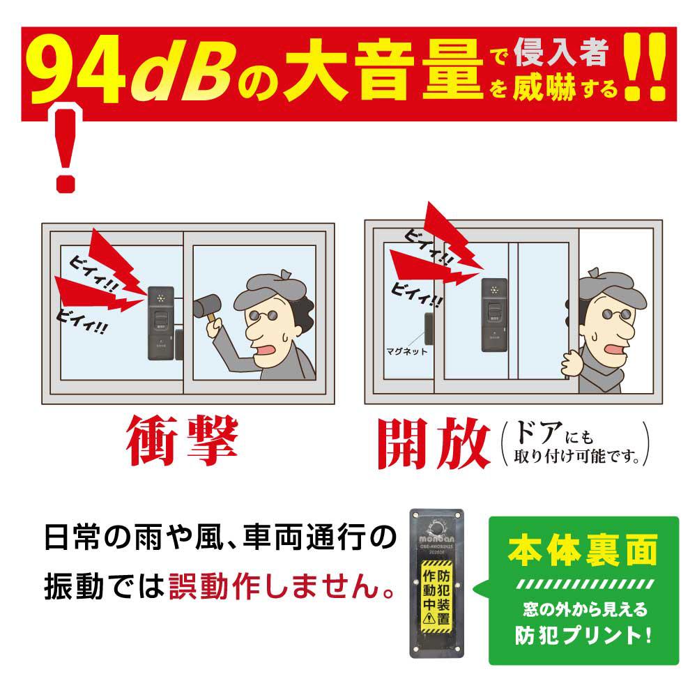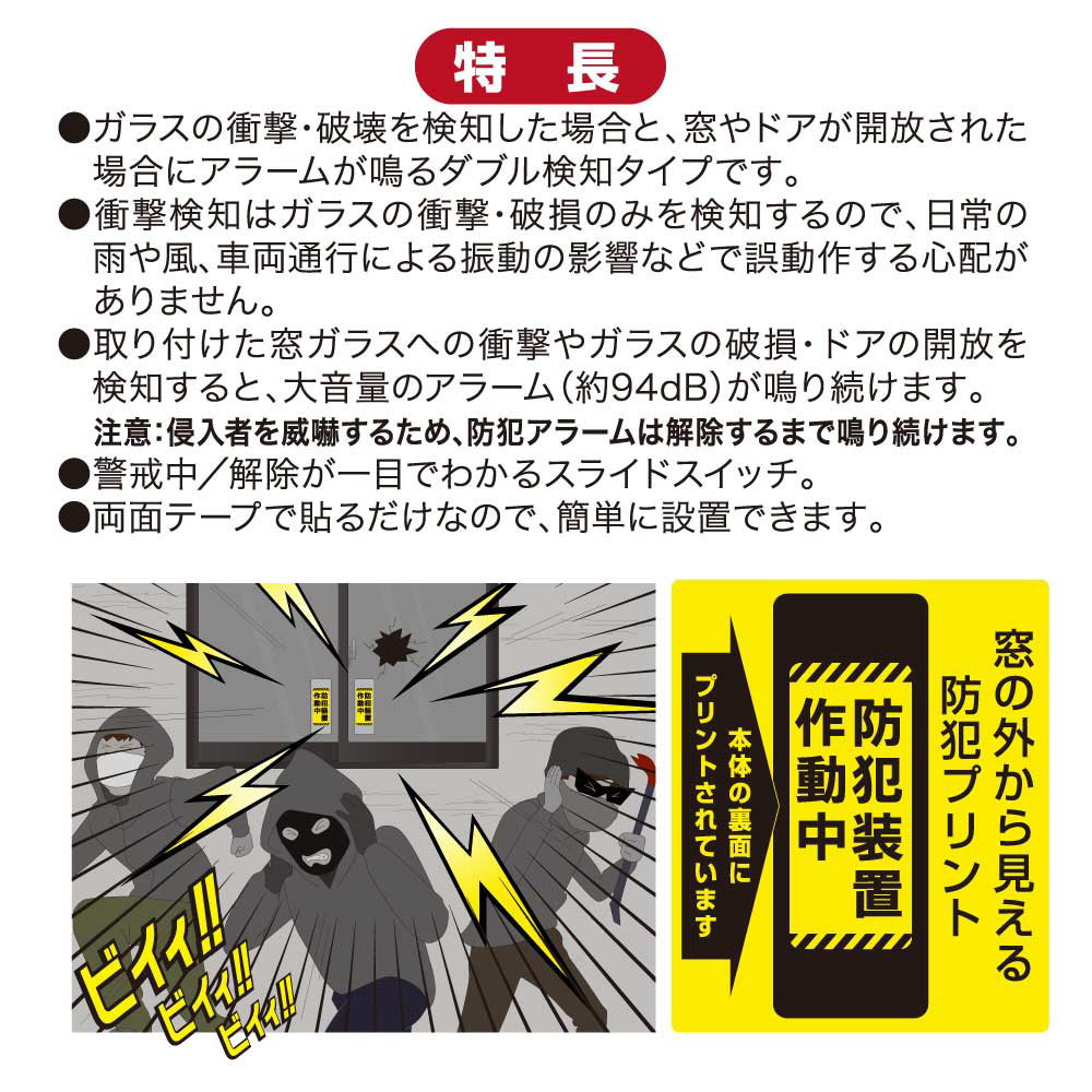 取り付けた窓ガラスへの衝撃や破損・ドアの開放を検知すると、大音量のアラーム(約94dB)が鳴り続けます。