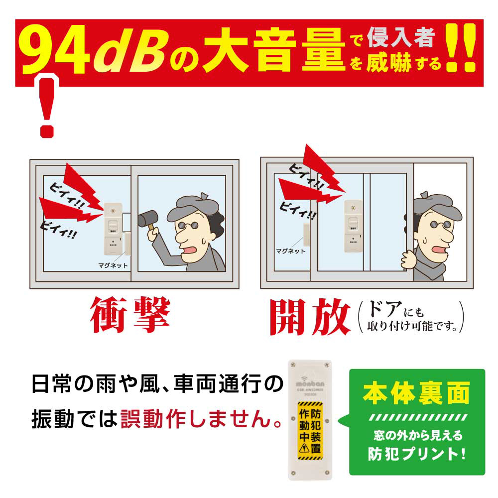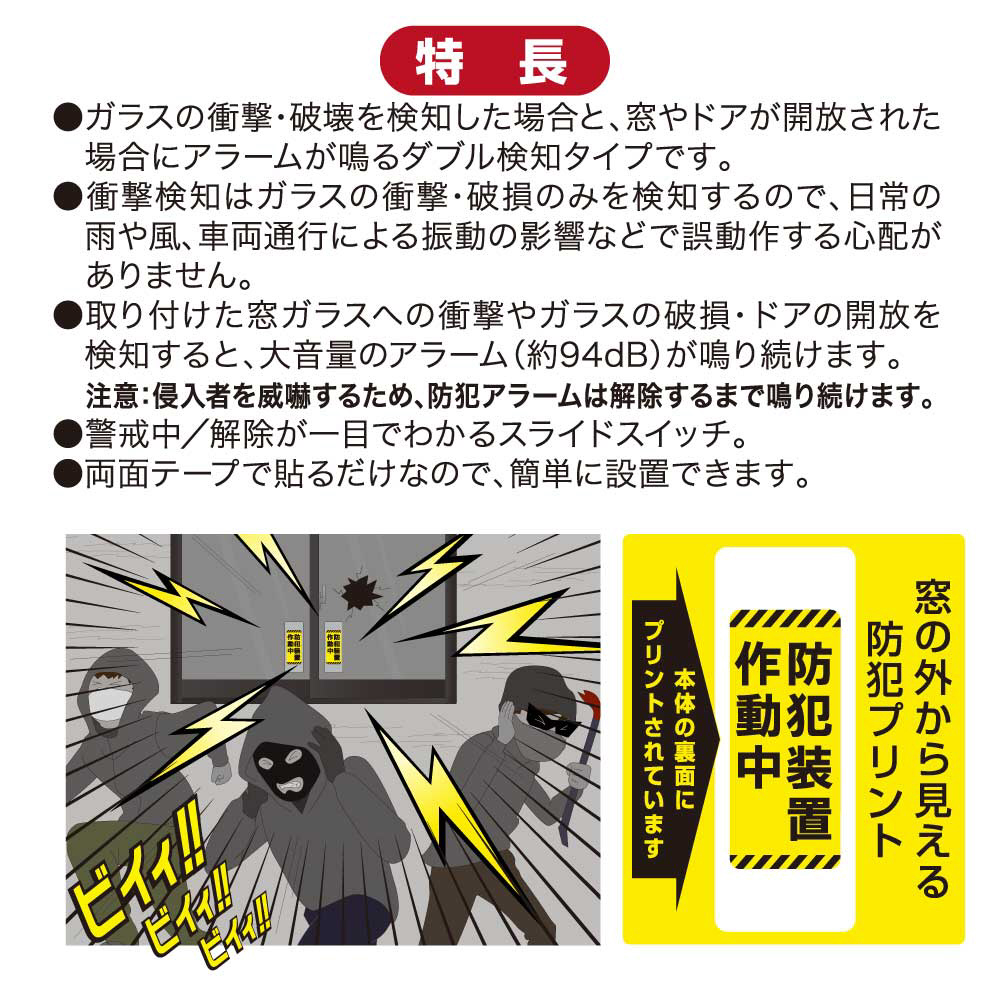 取り付けた窓ガラスへの衝撃や破損・ドアの開放を検知すると、大音量のアラーム(約94dB)が鳴り続けます。