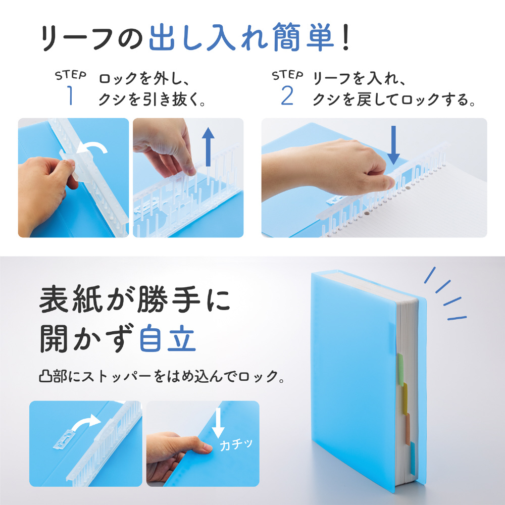 ストッパーをとじ具の凸部にはめ込んで表紙をロックすることができます。表紙をロックすると、リーフを入れても本体が倒れずしっかり自立します。