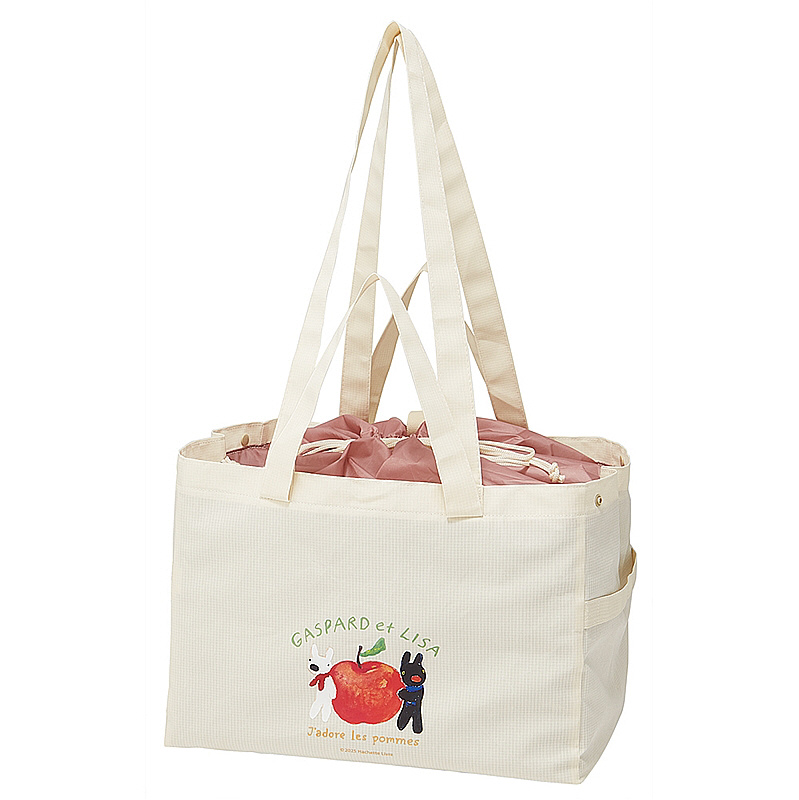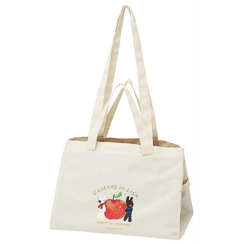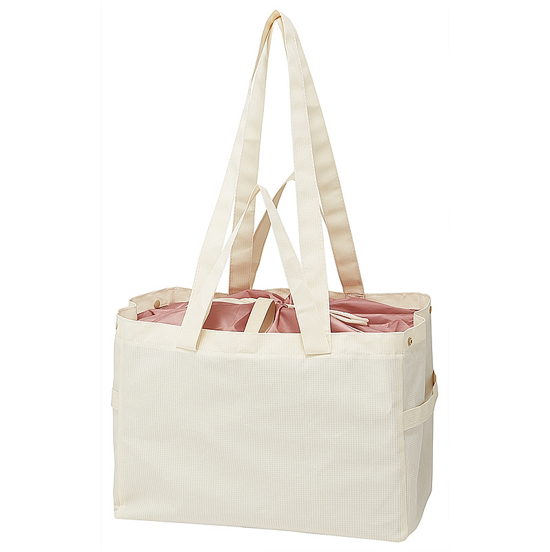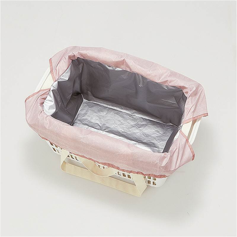 サイドベルト付きレジカゴバッグ。2種類の長さの持ち手付き。内側生地はシルバーコーティングで保冷効果。スリット入りでかごにセットしやすい。サイドに持ち手が付いて持ち上げ楽々便利。折りたたみ用ベルト付き。