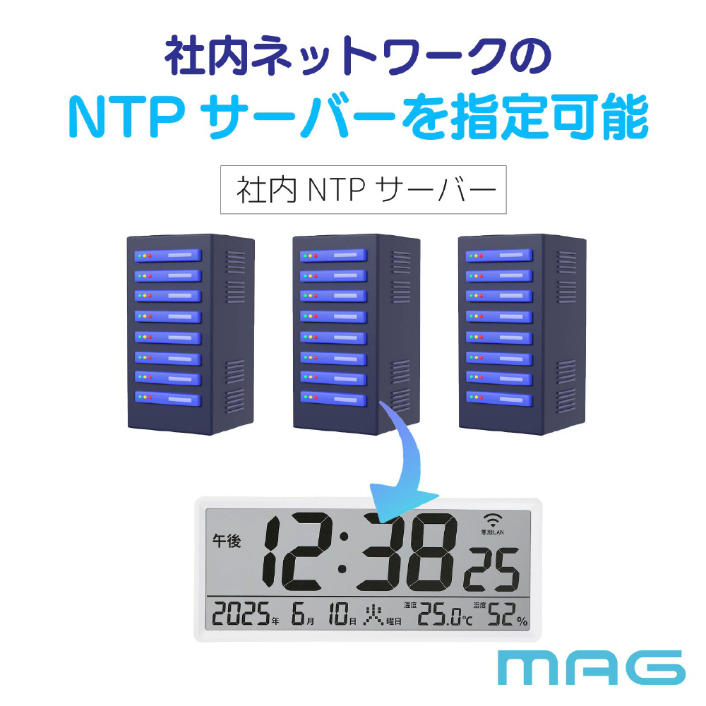 ・本製品は施設内の一つのネットワーク時刻情報(NTP)に同期するため、例えば各部屋に設置した時計それぞれに時間の個体差が発生しません。複数の部屋を利用するセミナーや試験会場などでもおすすめできます。また、タイムゾーン(時差)設定ができるため海外の時間表示が必要なビジネスシーンにも活躍します。