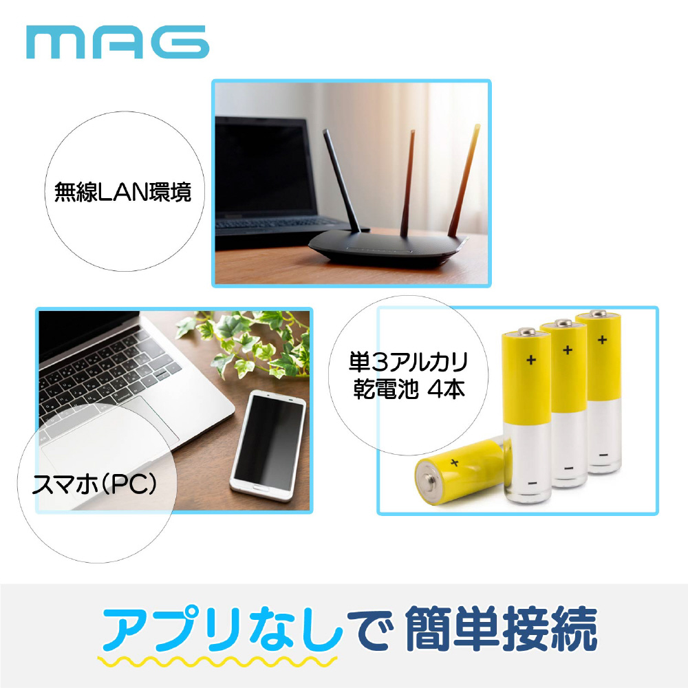 ・「無線LANネット環境」があれば「立地」や「設置場所」は問いません。またこのような類似製品では「専用アプリ」のダウンロードや利用が必須になることが多いですが、本製品は「専用アプリ」などは必要とせず、アプリの保持に縛られることもありません。