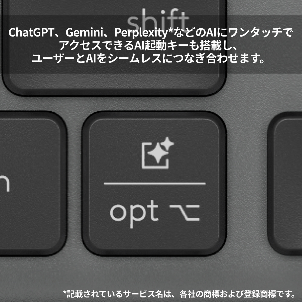 スクリーンショットキー、音楽の再生、ミュート/ミュート解除、音量コントロールなど、あらゆるシーンで使いやすいショートカットキーを搭載しています。また、ロジクール製品専用アプリ「Logi Options+」を使用することで、最大23個のショートカットをカスタマイズでき、マクロ登録機能「Smart Actions」を合わせて使うことで、作業効率が格段に向上します。さらに、ChatGPT、Gemini、Perplexity*などのAIにワンタッチでアクセスできるAI起動キーも搭載し、ユーザーとAIをシームレスにつなぎ合わせます。