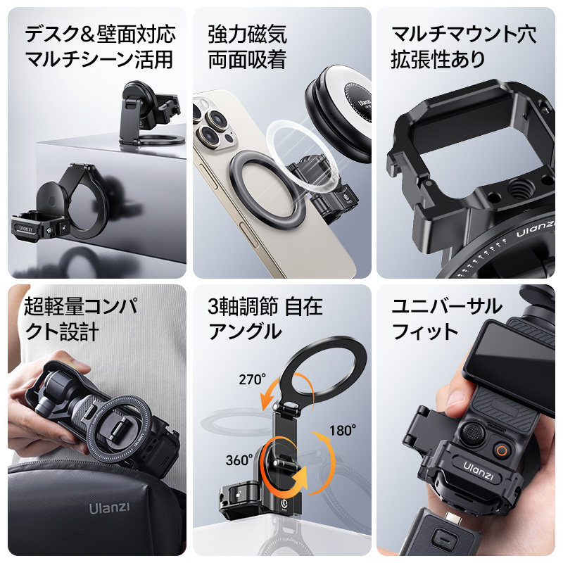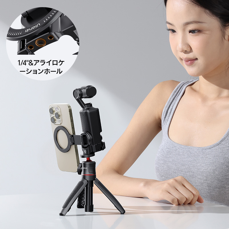 コールドシューマウント、Action インターフェース、1/4+ アレイ位置決め孔を搭載。さまざまなアクセサリーを外接でき、使用範囲を広げられます。?