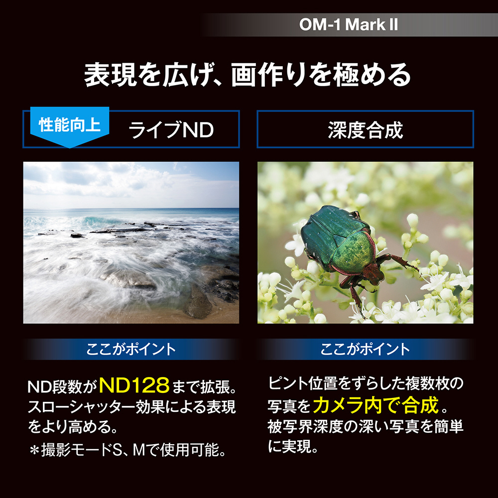 (電子制御フォーカルプレーンシャッター)1/8000〜60秒、バルブ、ライブタイム、ライブコンポジット