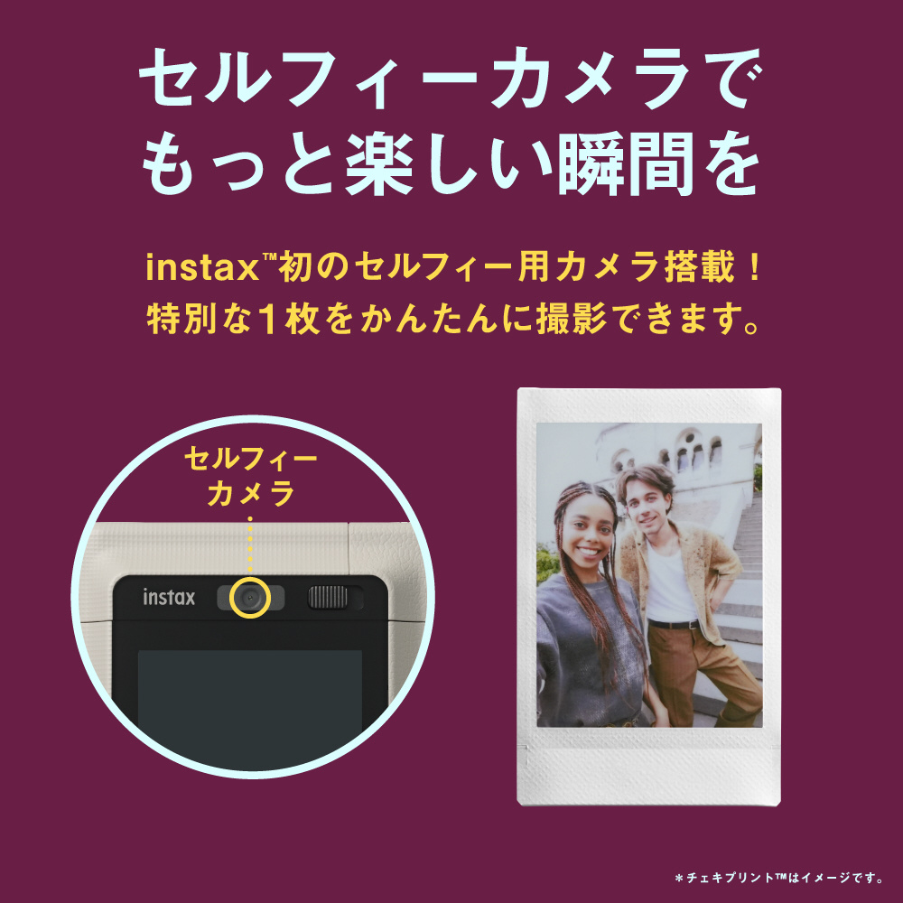 カメラ背面のモニターを確認しながら友達や家族と簡単にセルフィーができるよう、instaxシリーズ初のインカメラ(セルフィーカメラ)を搭載。
