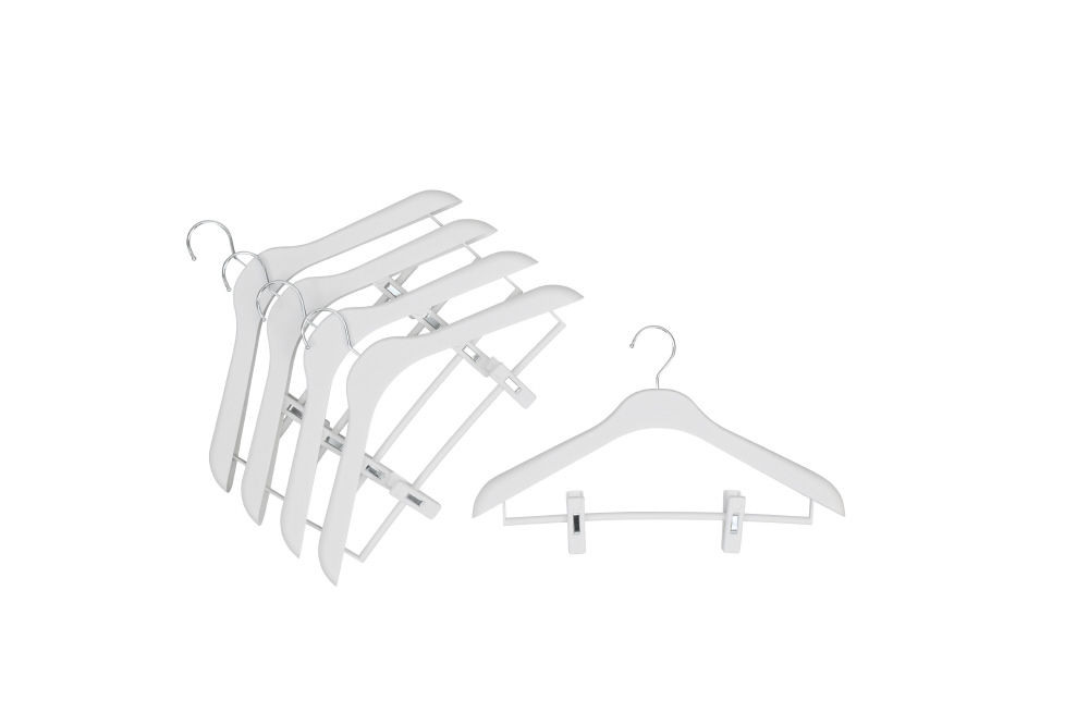 収納性を追求したスリム設計なスーツハンガー。お得な5本組セットです。肩部分の先端がラウンド形状で、肩のラインを内側からキープします。強力クリップ付でパンツ、スカートもまとめて収納できます。