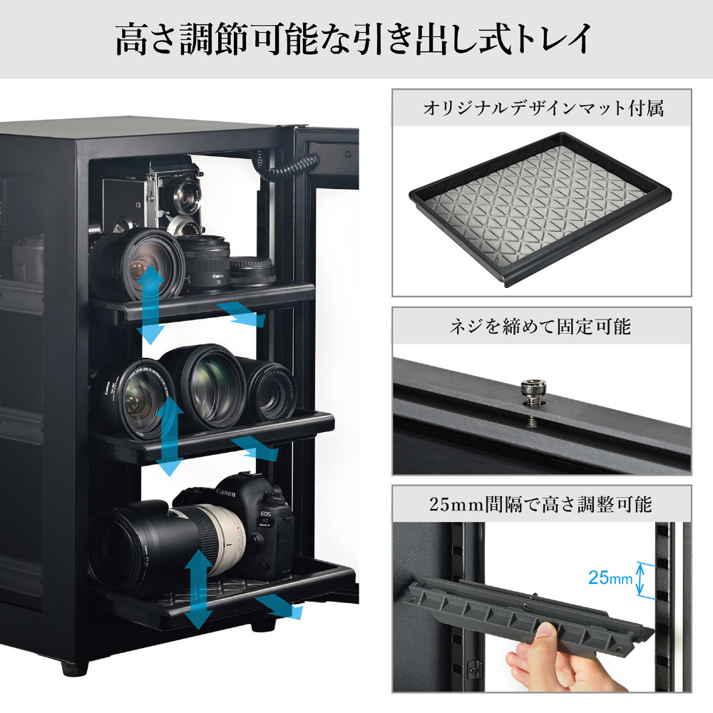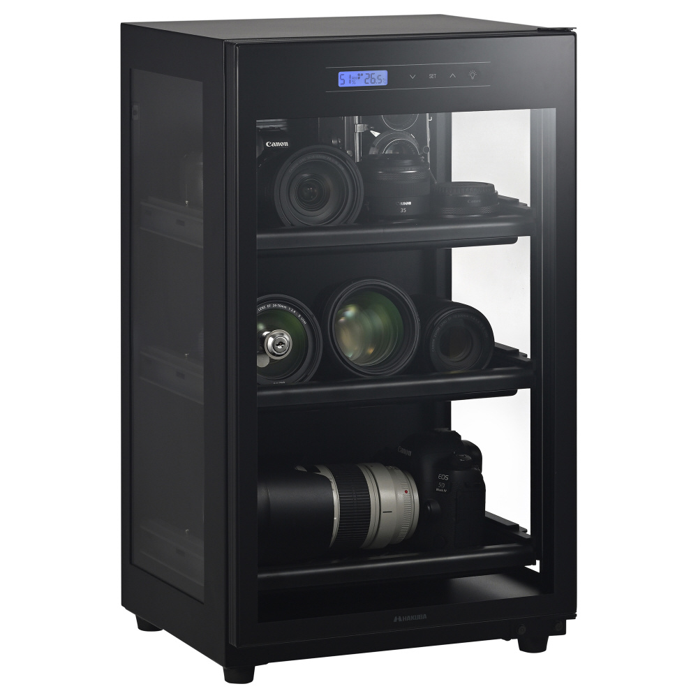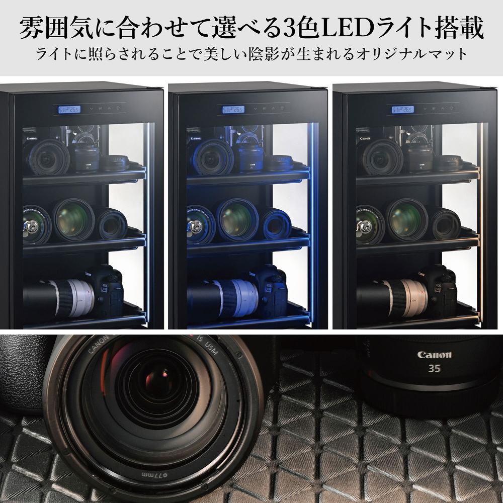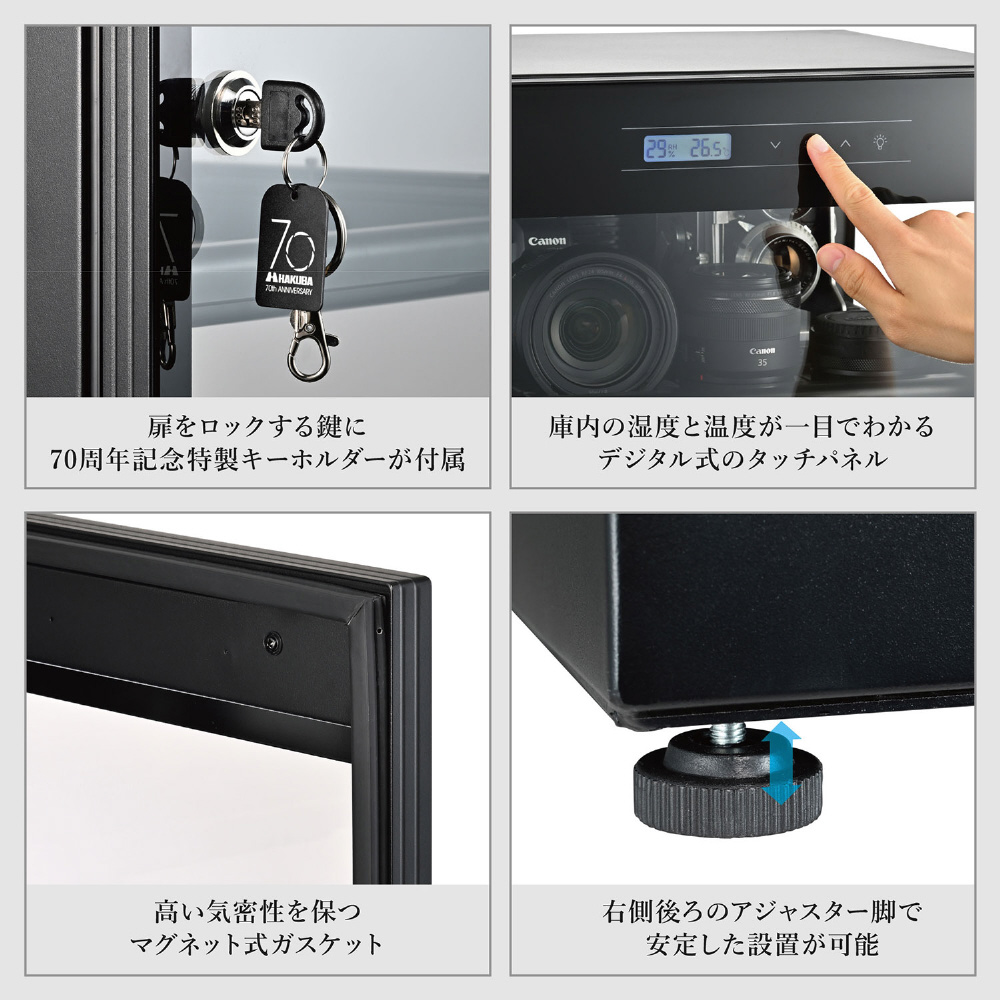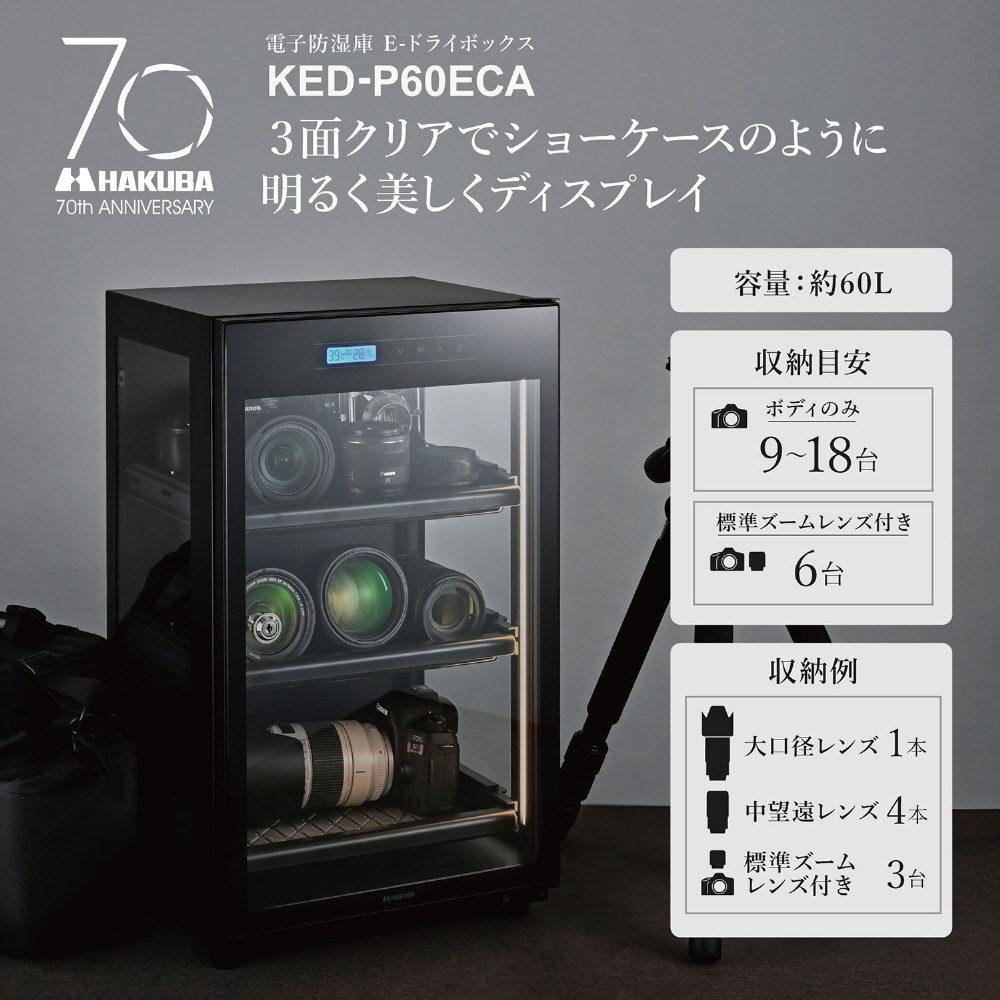 ディスプレイしながら湿気やホコリからカメラを守る電子式防湿保管庫E- ドライボックスシリーズに、ハクバ創立70周年を記念したプレミアムモデルが登場。