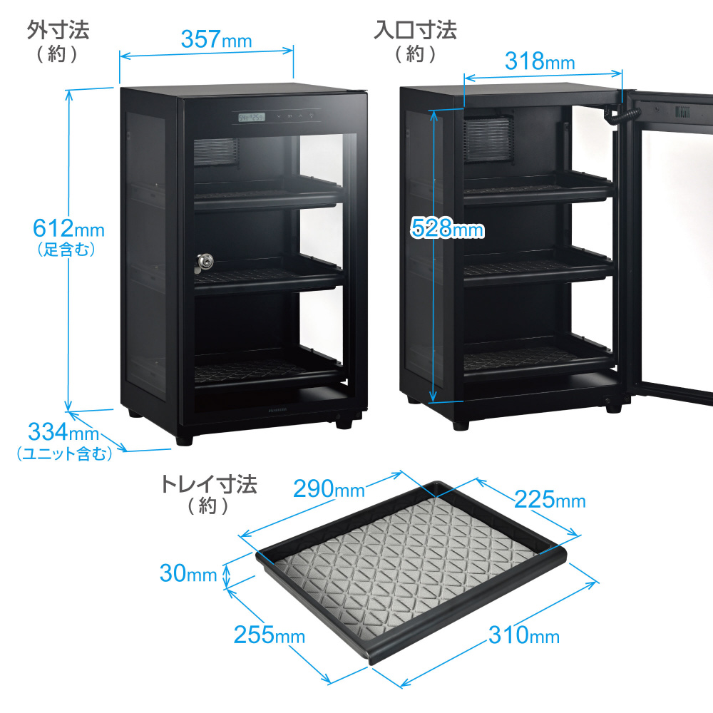 付属品 棚マット(3枚)、棚トレイ(3枚)、棚受け(6本)、棚トレイ固定ネジ(6本)、六角レンチ、ACアダプター、アジャスター足、鍵(2個)、70周年キーホルダー、取扱説明書