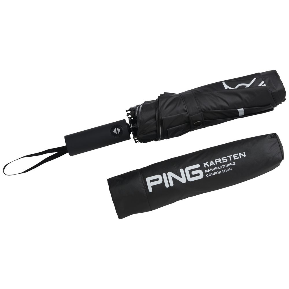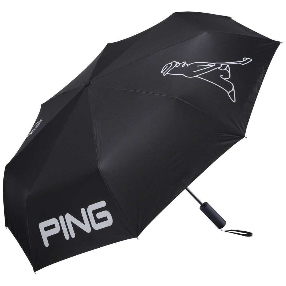 PINGロゴとMR.PINGのプリントが目を引く晴雨兼用折りたたみ傘。