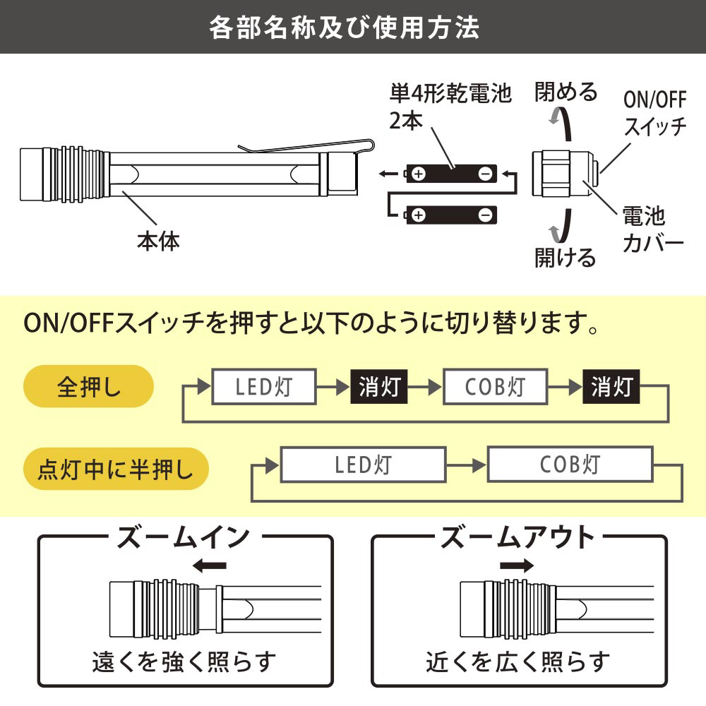 ■ 連続点灯時間:LED…約5時間/COB…約4.5時間 ※未使用・新品アルカリ乾電池使用時 ※電池の性能や使用状況により異なります