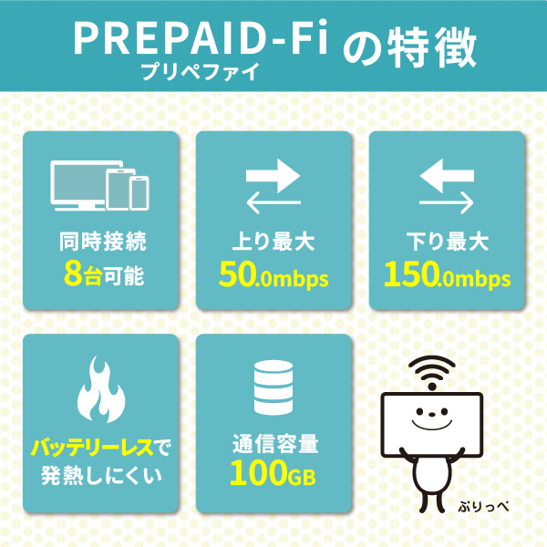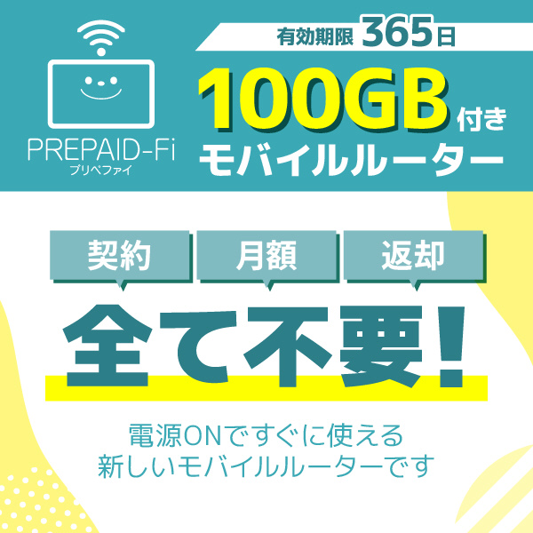 「PREPAID-Fi」は届いたら契約不要で届いたらすぐ使える、新しいモバイルルーターです。「縛り」や「月額料金」なしで、快適にデータ通信を利用いただけます。あらかじめ100GBのデータ容量がチャージされています。