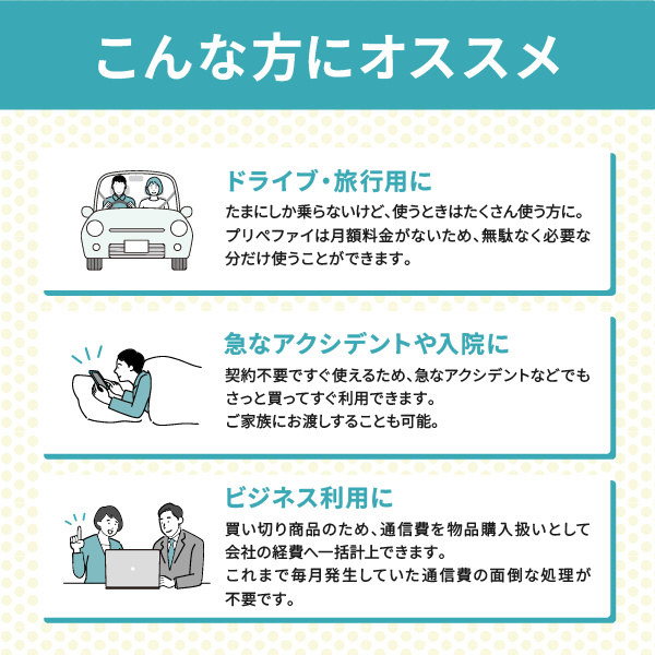 解約金等の契約期間の縛りや、月額費用も発生しません。利用したい時に通信を開始でき、データが足りなくなったらいつでもチャージ。