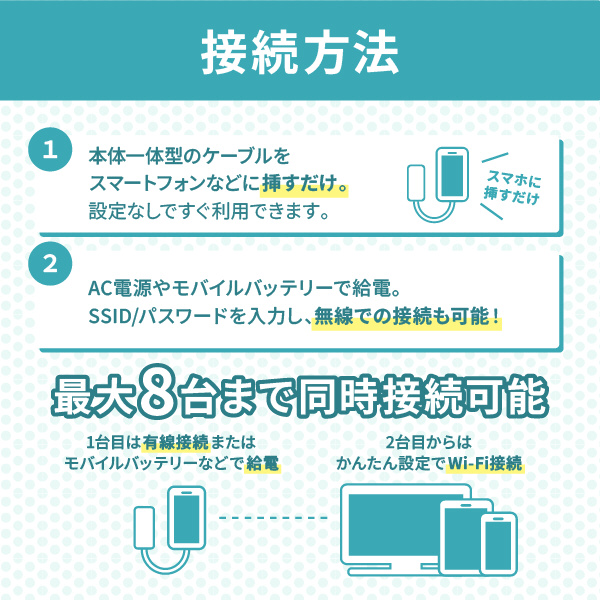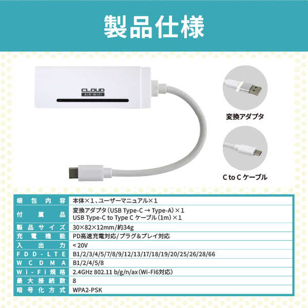 またType-Cの充電ができるポートが本体に空いているため、WiFiも使いながら他デバイスの充電が可能。急速充電用ケーブルも同梱しています。