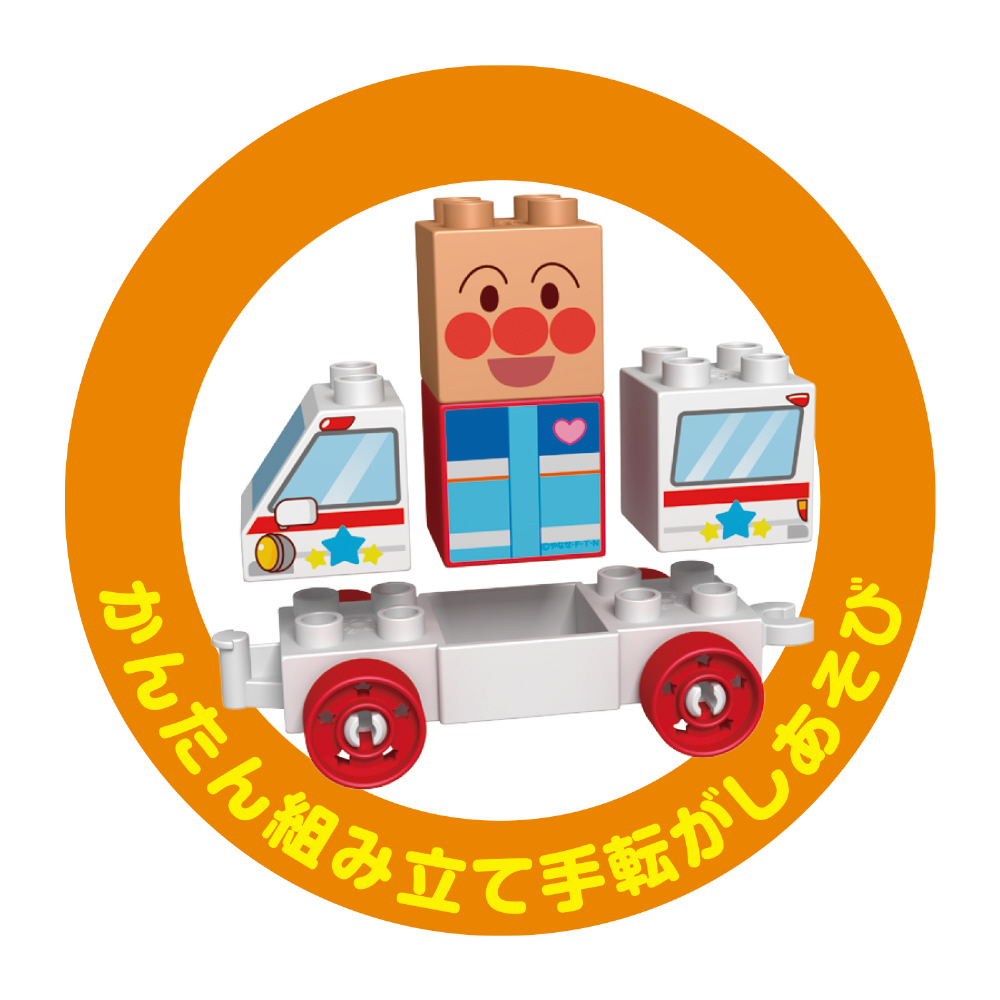 小さなお子さまでも簡単に組み立てて、手転がし遊びができるアンパンマンと救急車のブロックセットです。