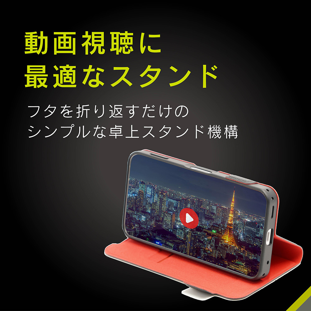 衝撃から守り、1枚収納カードポケットを搭載した、スタンド機能付き薄型フリップケースです。