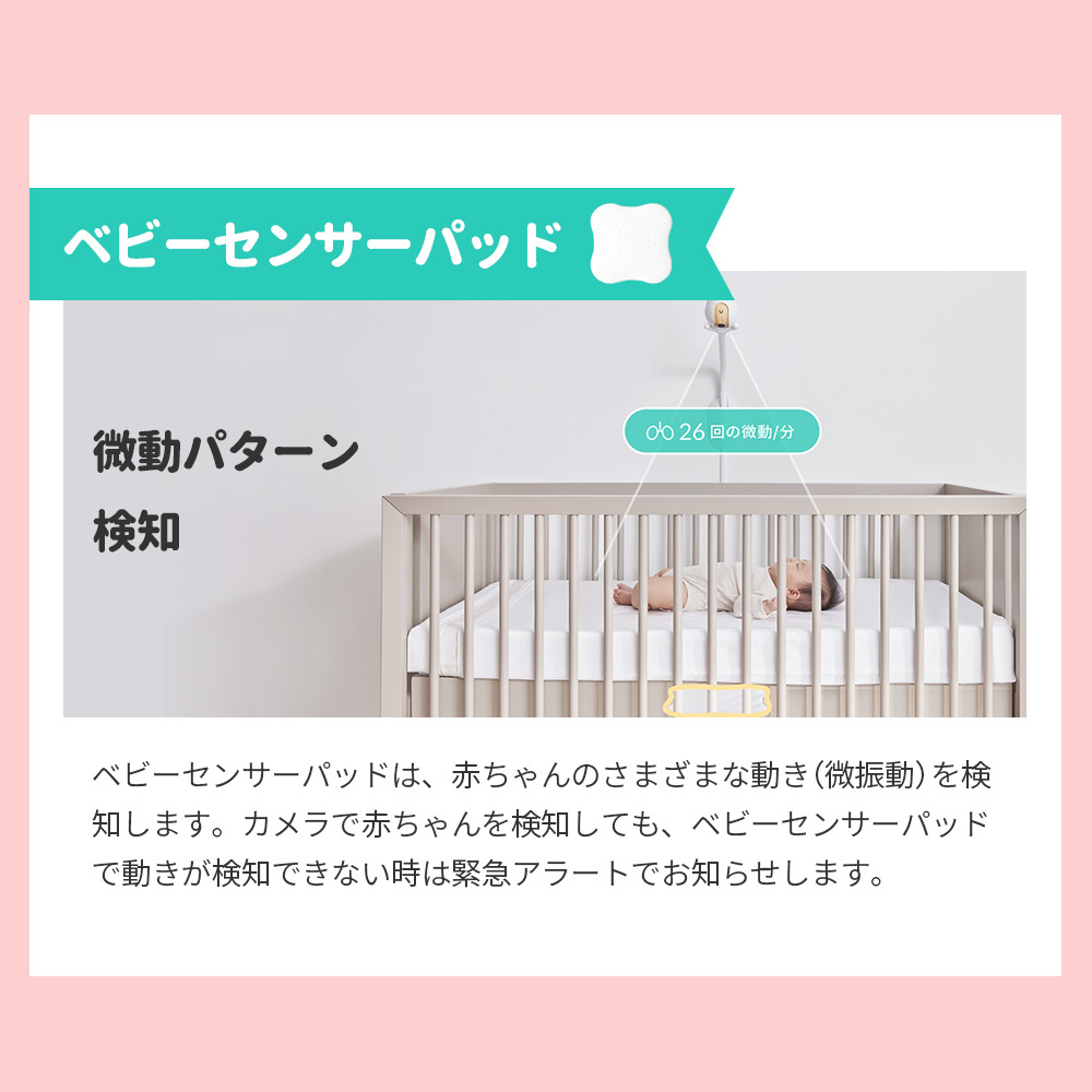 カメラと連動しているので、赤ちゃんがベッドにいるかもあわせて判断します。カメラで赤ちゃんを検知しているのに、ベビーセンサーパッドで動きが検知できない時に緊急アラートでお知らせします。