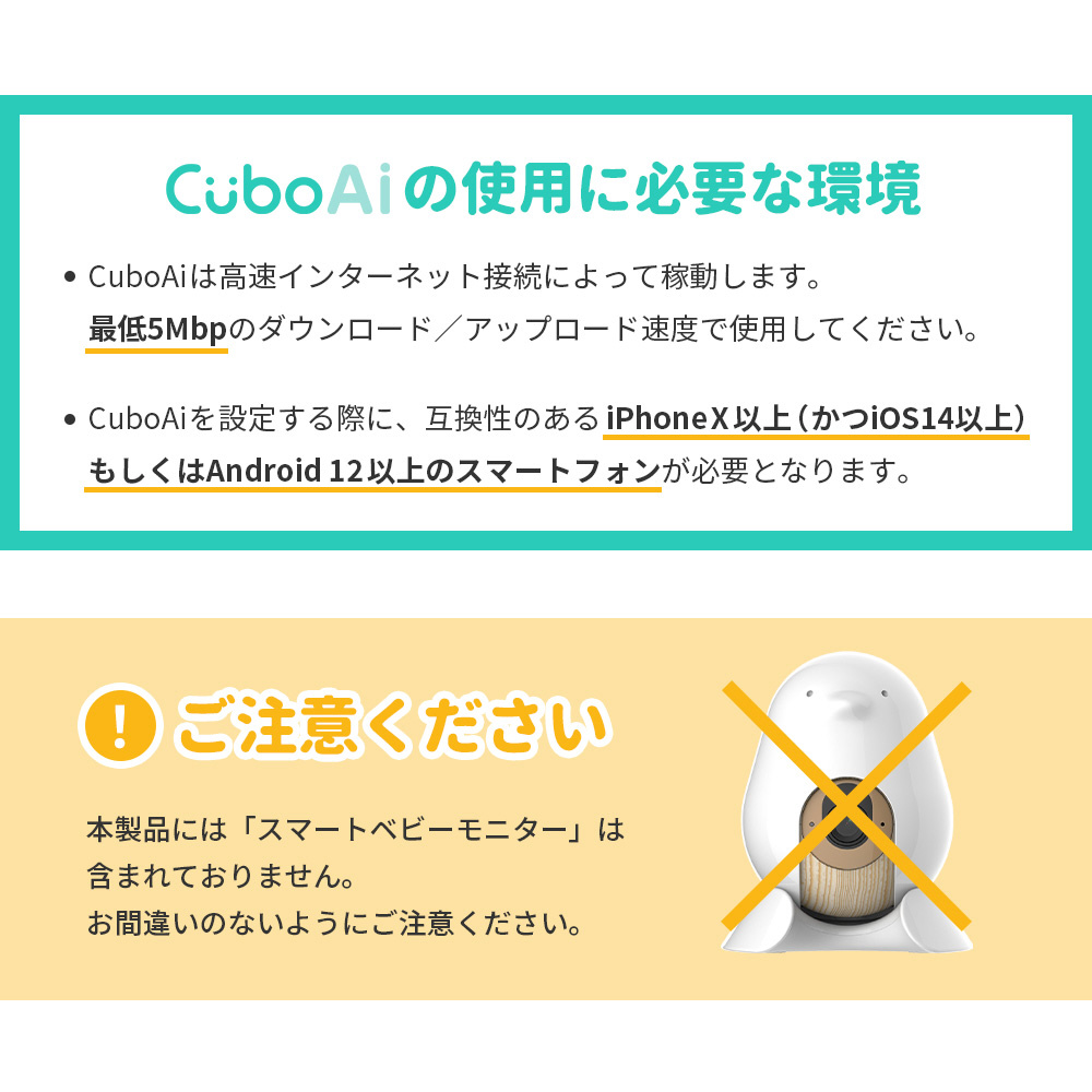 仕様2 ●使用に必要な環境: ・Cubo Ai Plus スマートベビーモニターとペアリングする必要があります ・最低5Mbpのダウンロード/アップロード速度 ・【設定する際に】iPhoneX以上(かつiOS14以上)もしくはAndroid12以上のスマートフォン ・ベビーセンサーパッドは、ベビーベッドのマットレスの下の中央に置いてください。マットレスの厚さは、最適な精度を得るために6〜13cmの間である必要があります。
