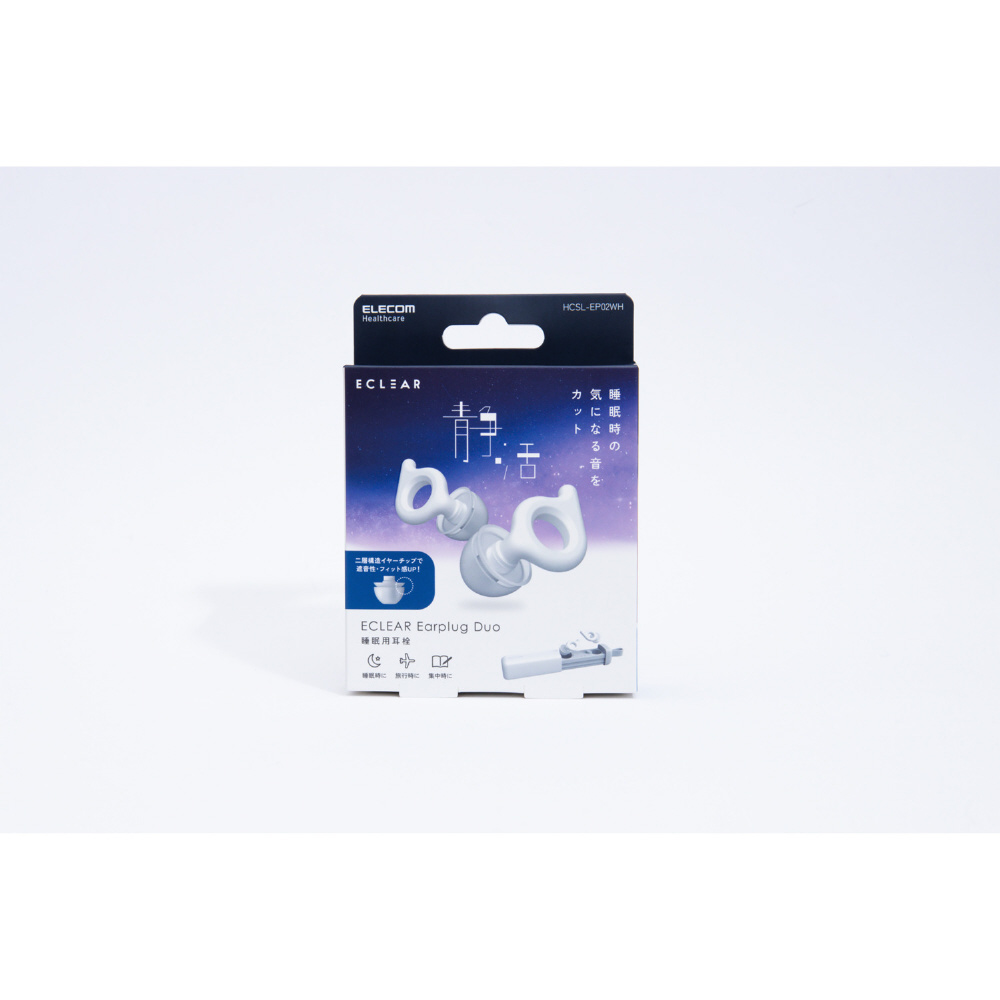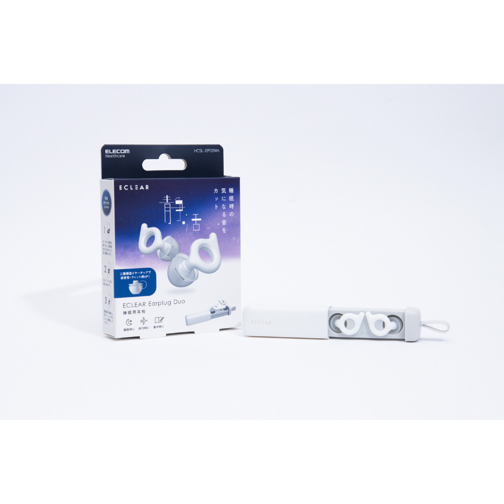 高い遮音性能で快眠環境をサポートする耳栓”エクリアイヤープラグデュオ”です。朝まで快適に騒音から守ります。