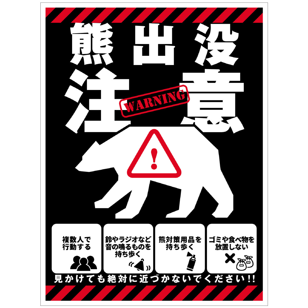 熊出没注意サインは熊が出没したことを知らせる注意喚起の標識です。山間部や出没付近に取り付けて、周囲に知らせます。目立つイラスト入りで視認性も優れています。