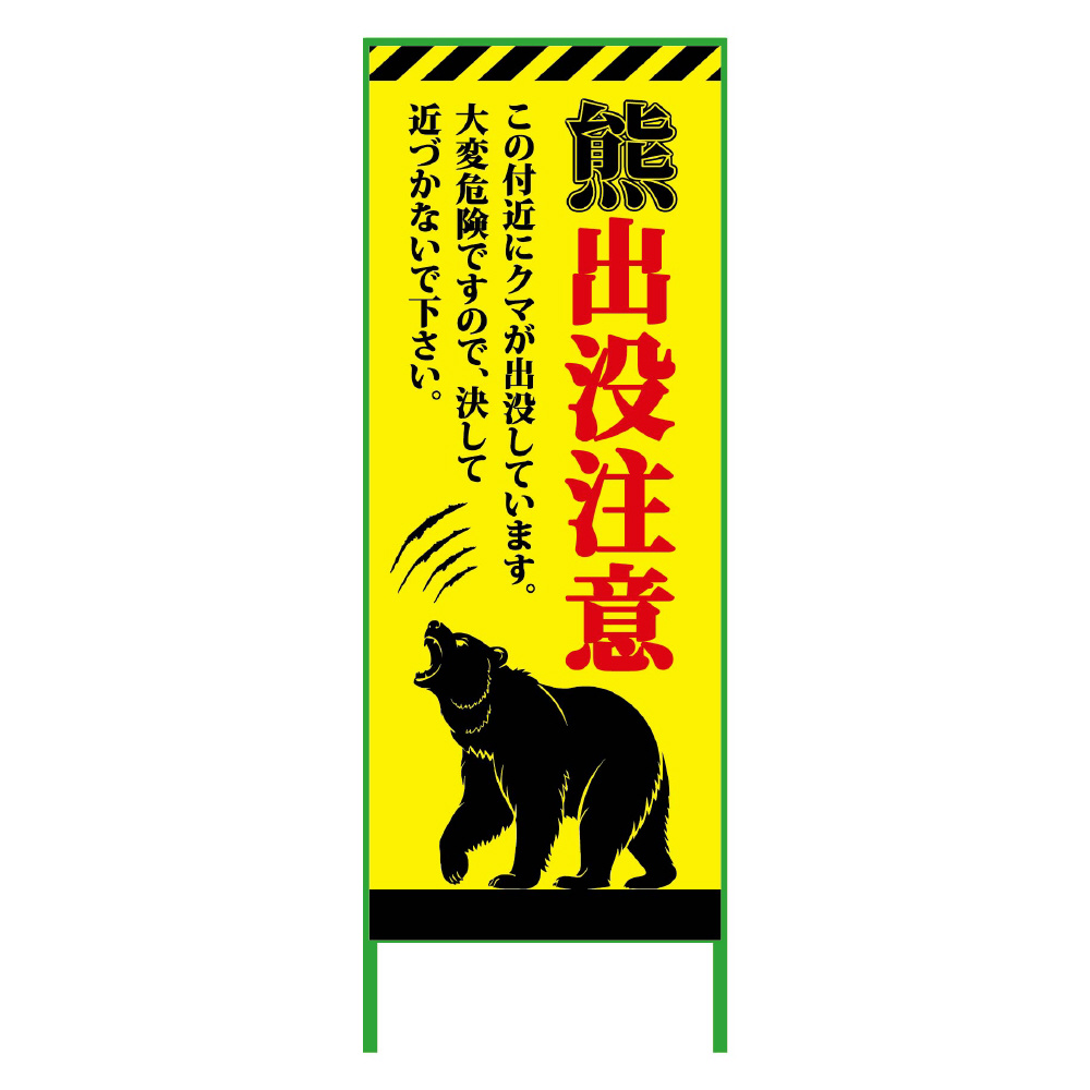 熊出没注意看板は熊が出没したことを知らせる注意喚起の標識です。出没付近に取り付けて、周囲に知らせます。目立つイラスト入りで視認性も優れています。自立用の鉄枠付になります。無反射でラミネート加工なので擦れに強いです。