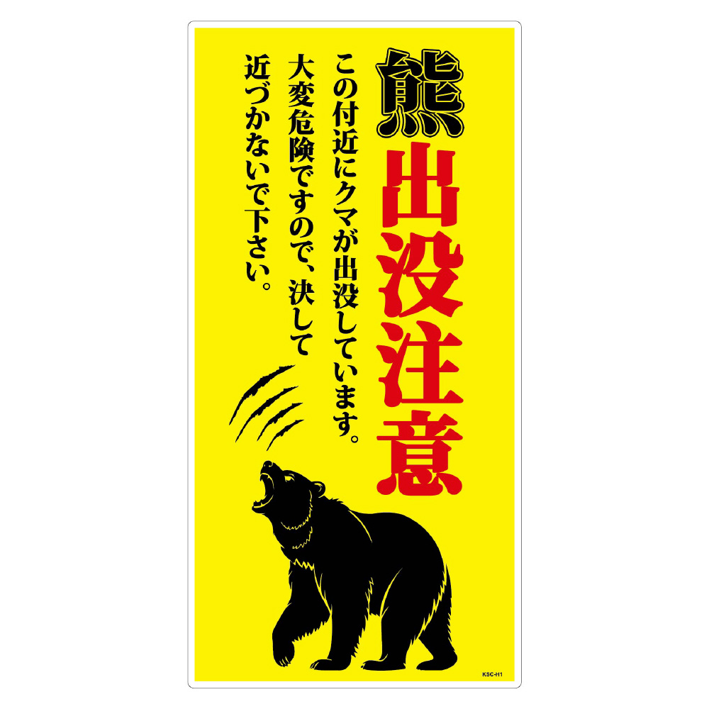 熊出没注意サインは熊が出没したことを知らせる注意喚起の標識です。山間部や出没付近に取り付けて、周囲に知らせます。目立つイラスト入りで視認性も優れています。