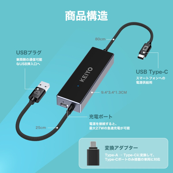 多くの車両がUSB-Aポートを搭載している一方で、最近の車両ではUSB Type-Cポートのみの場合もあります。AN-S155には、そうしたUSB Type-Cポートのみが搭載された車両でも問題なく使用できるよう、USB-AからType-Cへの変換アダプターが付属しています。これにより、幅広い車種での互換性が確保されています。