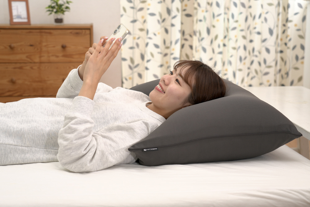 背中から頭までしっかりカバーする大判なつくりにより自然な傾斜が生まれ、リラックスした姿勢で携帯電話を見ることができます。就寝時にご使用もOK!