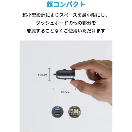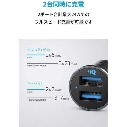 Anker独自のPowerIQ対応のUSB-Aポートを2つ搭載し、運転手も同乗者も同時にフルスピード充電が可能です。