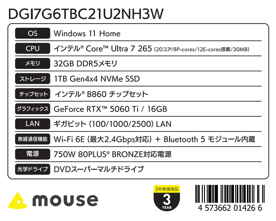 DGI7G6TBC21U2NH3W ゲーミングデスクトップパソコン G TUNE(RTX 5060 Ti) ホワイト [モニター無し /Windows11 Home /intel Core Ultra 7 /メモリ:32GB /SSD:1TB /無し]