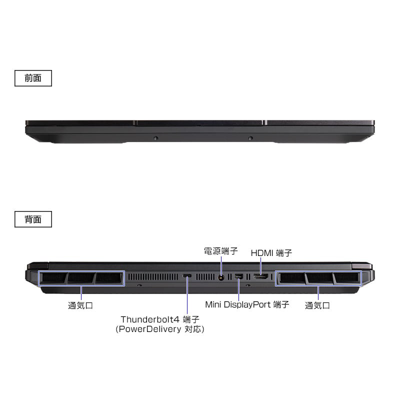 USB Type-C(背面:Thunderbolt 4×1 ※USB PD入出力に対応、左側面:USB 3.2 Gen 2(10Gbps)×1 ※USB PD入出力に対応) USB Type-A(右側面:USB 3.2 Gen 1(5Gbps)×2、左側面:USB 3.2 Gen 1(5Gbps)×1) ディスプレイ出力(背面:Mini DisplayPort×1/HDMI×1/Thunderbolt 4×1、左側面:USB 3.2 Gen 2 Type-C×1) LAN(2.5G/1000/100BASE-T) サウンド(左側面:ヘッドホン出力・ヘッドセット/4極(CTIA準拠)×1)
