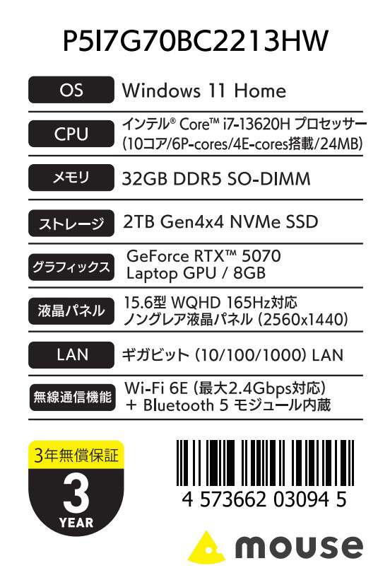 P5I7G70BC2213HW ゲーミングノートパソコン G TUNE 15.6(RTX 5070) ホワイト [15.6型 /Windows11 Home /intel Core i7 /メモリ:32GB /SSD:2TB /無し /日本語版キーボード]