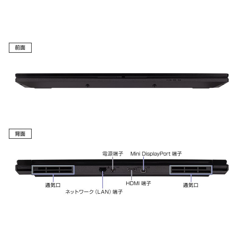USB Type-C(右側面:USB 3.2 Gen 2 (10Gbps)×1 ※画面出力に対応) USB Type-A(右側面: USB 3.2 Gen 2 (10Gbps)×1 ※常時給電に対応、左側面: USB 3.2 Gen 1 (5Gbps)×1、USB 2.0×1) ディスプレイ出力(背面:Mini DisplayPort×1 / HDMI×1、右側面:USB 3.2 Gen 2 Type-C×1) LAN(1000/100/10BASE-T) サウンド(左側面:ヘッドホン出力・ヘッドセット/4極(CTIA準拠)×1)