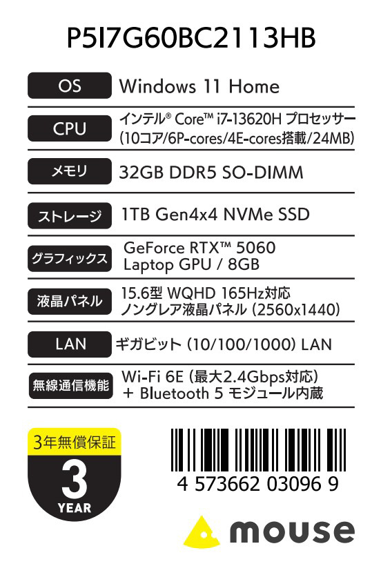 P5I7G60BC2113HB ゲーミングノートパソコン G TUNE 15.6(RTX 5060) ブラック [15.6型 /Windows11 Home /intel Core i7 /メモリ:32GB /SSD:1TB /無し /日本語版キーボード]