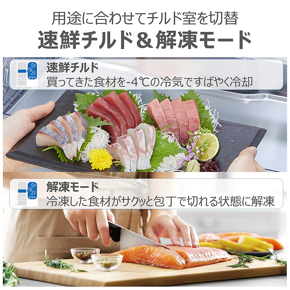 食品収納スペースの目安 ・冷蔵室: <188L> ・うち、チルドルーム: <18L> ・野菜室: <71L> ・製氷室: <6L> ・冷凍室上段: <13L> ・冷凍室下段: <56L>