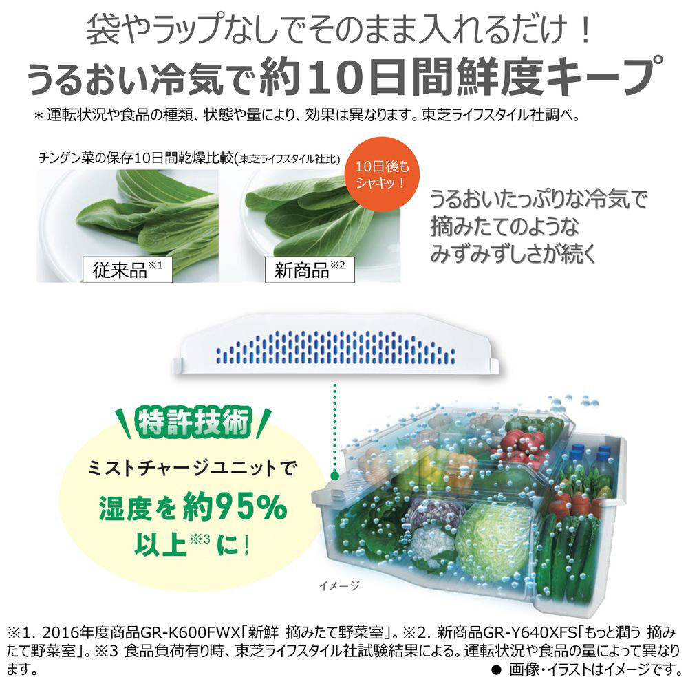 ・「速鮮チルド」東芝独自のツイン冷却により、食品が凍らない-4℃前後の高湿度冷気を送り込み、買い物後に温度が上がった食材を急速に冷やし、鮮度が落ちるのを防ぎます。また、常温の缶飲料をすぐにひんやりさせたいときにも便利です。