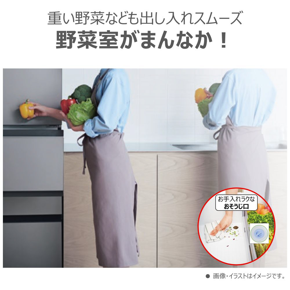 冷蔵室に次いで使用頻度が高い野菜室を冷蔵庫の「まんなか」に配置。取り出しやすい位置にあるため、かがむことなく重たい野菜も楽に出し入れすることができます。使いやすさに加えてケースの底面に設けた「お掃除口」の採用により、お手入れもより簡単になりました。よく汚れる野菜室を掃除する際、野菜室の大きなケースを外すことなく、野菜くずや泥を「お掃除口」から捨てることが出来ます。野菜室がまんなかにあるため、引き出した野菜室の下にゴミ箱を用意すれば手を汚すこともありません。