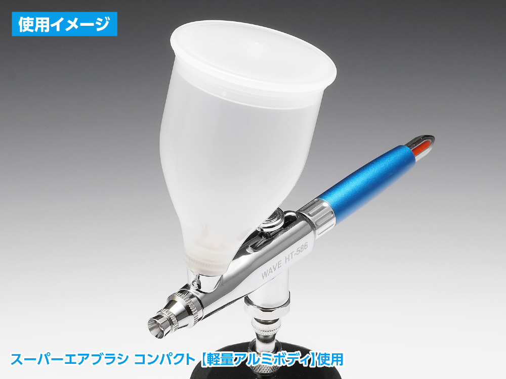 大容量ですのでサーフェイサーやベースカラーの塗装時もつぎ足す回数が減り便利です。耐溶剤性に優れ、中身の残量も分かりやすい半透明のPP(ポリプロピレン)材を採用。エアブラシとの接続部分にはテフロンOリングが装着済みで、ラッカー系溶剤への耐久性も万全としました。