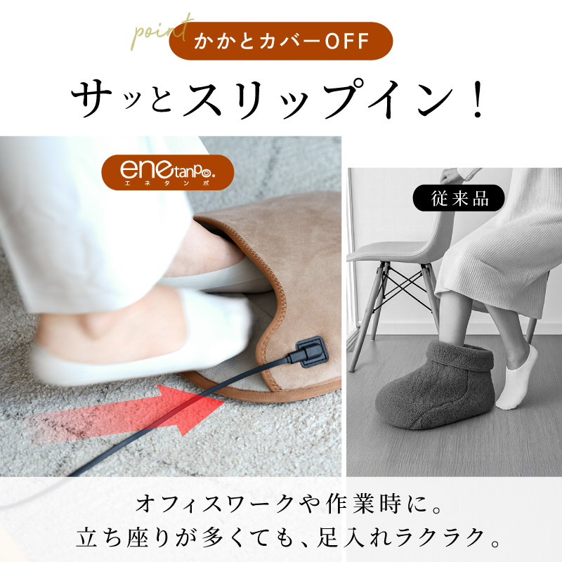 かかとカバーは、立ち座りが多い時は外してスリップイン、冷えが気になる時は被せて保温性を高めます。