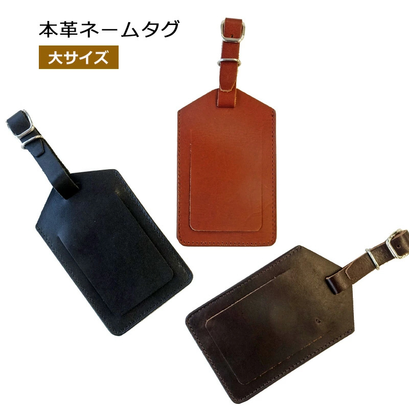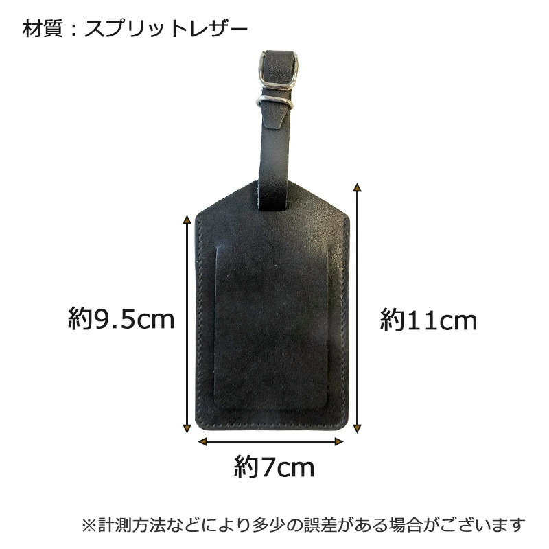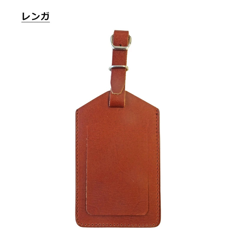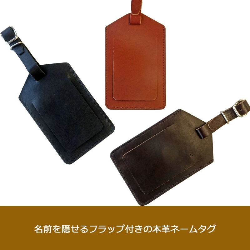 本革(スプリットレザー)を使用したネームタグ。荷物の目印として、また、ロストバゲージになった際に、荷物を手元に戻すための手がかりとして、ネームタグをつけて旅程表を入れておくことをオススメします。名前が隠れるフラップ付き。