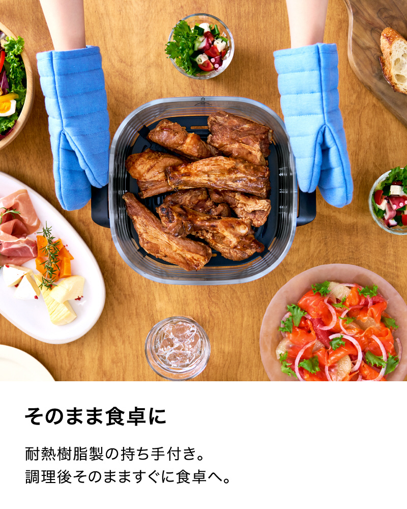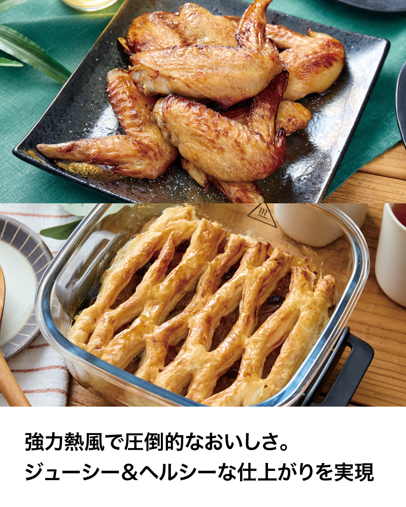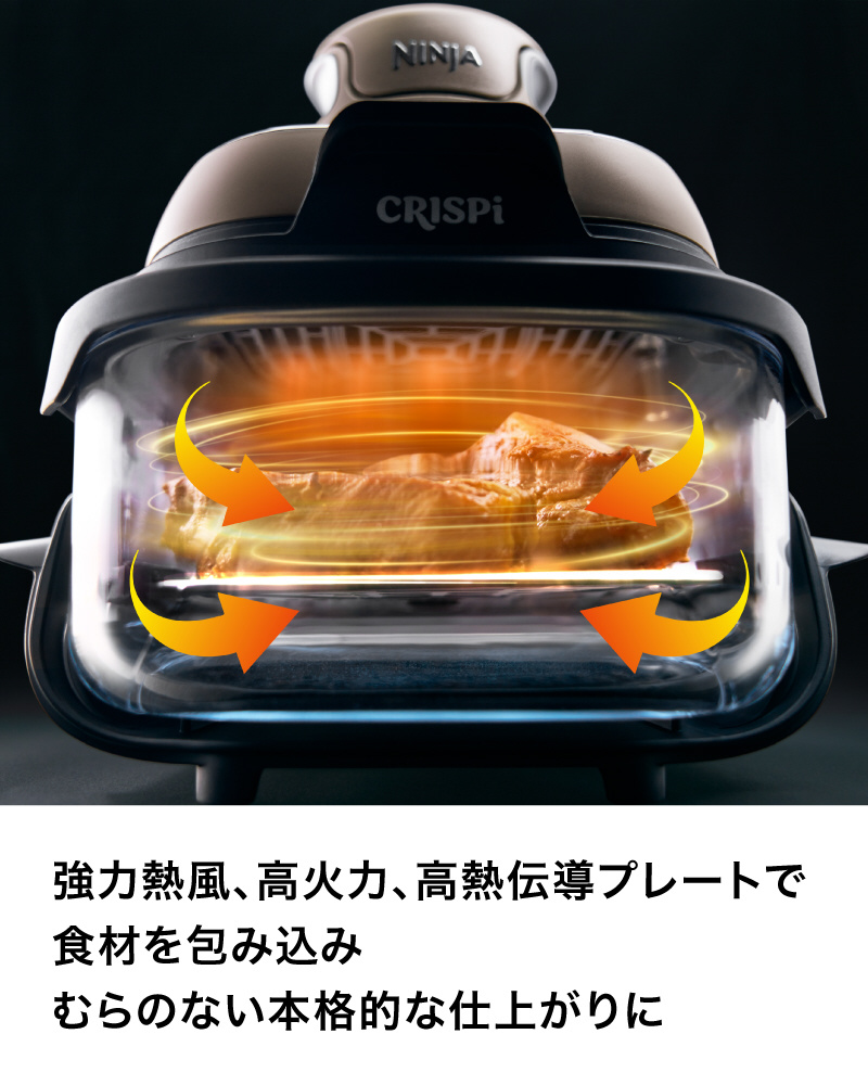 ■大型の「強力熱風ファン」、1,400Wの「高火力ヒーター」、アルミニウム製の「高熱伝導プレート」による3つの熱伝導による熱で食材を包み込むので、食材の外側はカリッと、中はジューシーに本格的な仕上がりを実現する