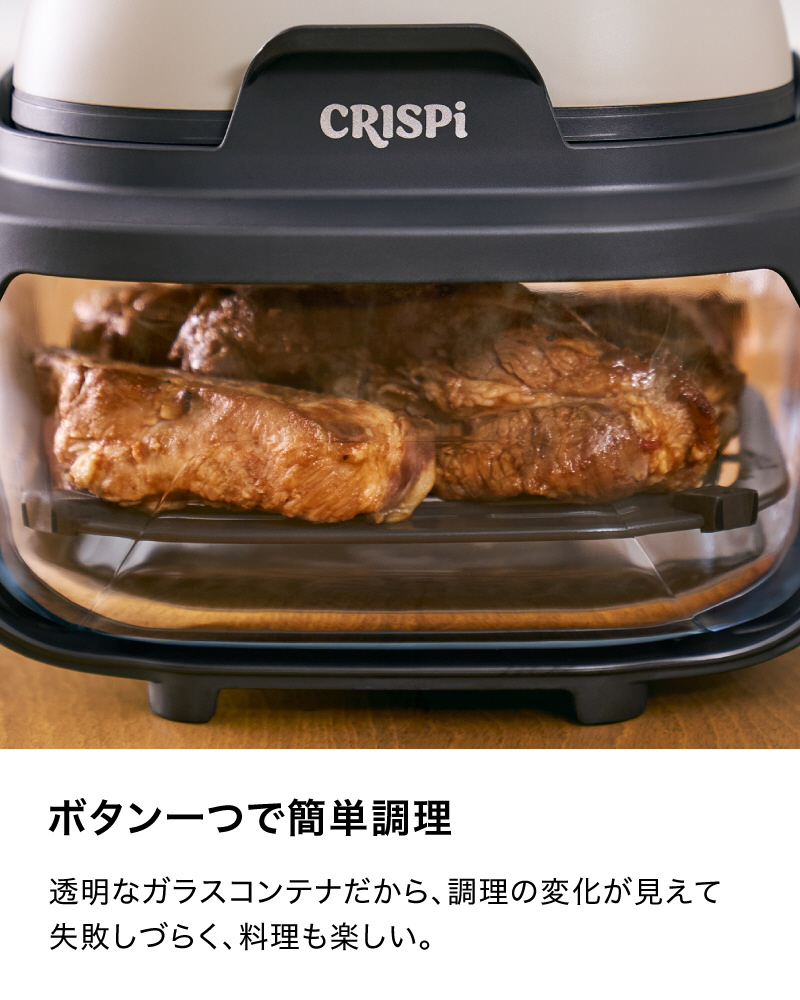 ■クリスプ、ベイク・ロースト、リクリスプの3つの調理モードにより、「クリスプ」は揚げ物がカリッとジューシーに、「ベイク・ロースト」はハンバーグや魚料理、スイーツがふっくらに、「リクリスプ」は揚げ物の温め直しに、簡単お任せで様々な料理が仕上がる