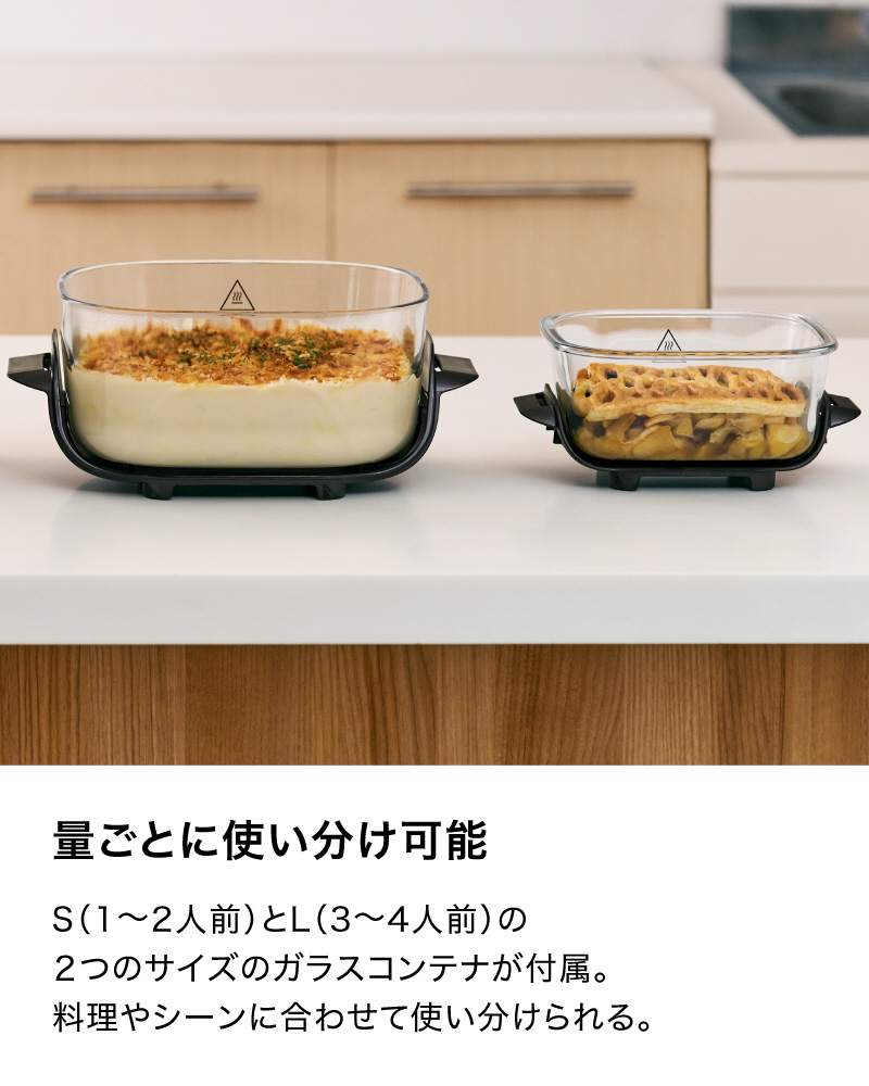 ■LとSの2つのサイズのガラスコンテナが付属するので、人数が多いときやたくさん作るときは大型のLサイズ、少人数や少量の時はコンパクトなSサイズ、とシーンに合わせてコンテナサイズを選べるので、無駄なく効率よく料理ができる