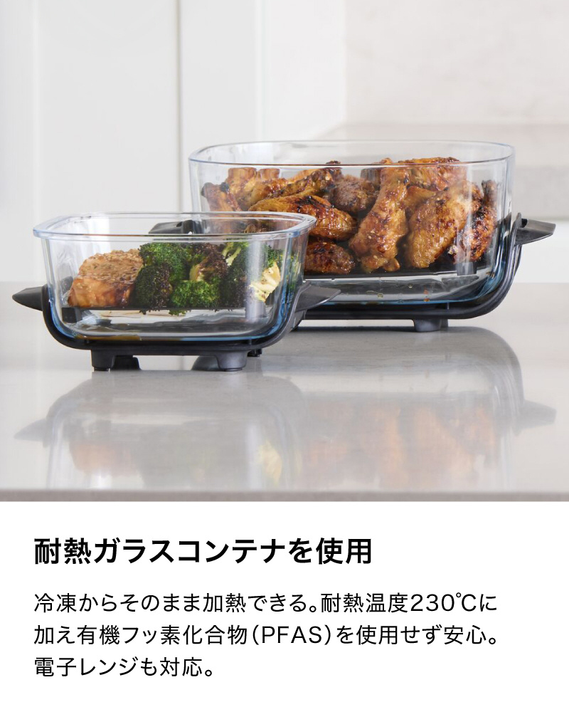 ■ガラスコンテナ、プレート、フタはすべて、人体や環境に影響を及ぼす可能性のある有機フッ素化合物(PFAS)を使用しておらず、プレートはナノセラミック加工なので安心して使える
