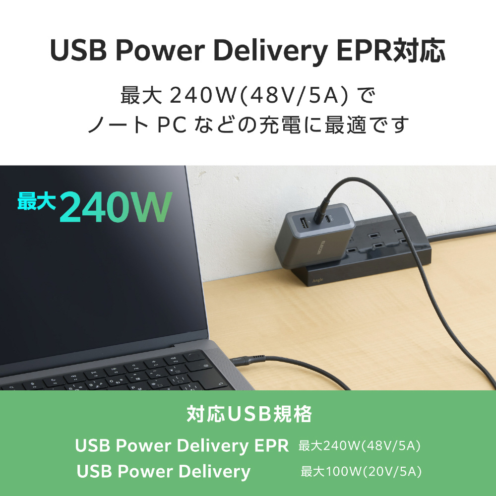 USB Power Delivery EPR対応により、最大240W(48V/5A)の電力で接続機器への充電が可能です。ハイスペックパソコンをはじめ、高出力を必要とする機器を充電する際も安心です。また、従来のUSB Power Delivery 最大100W(20V/5A)にも対応しています。