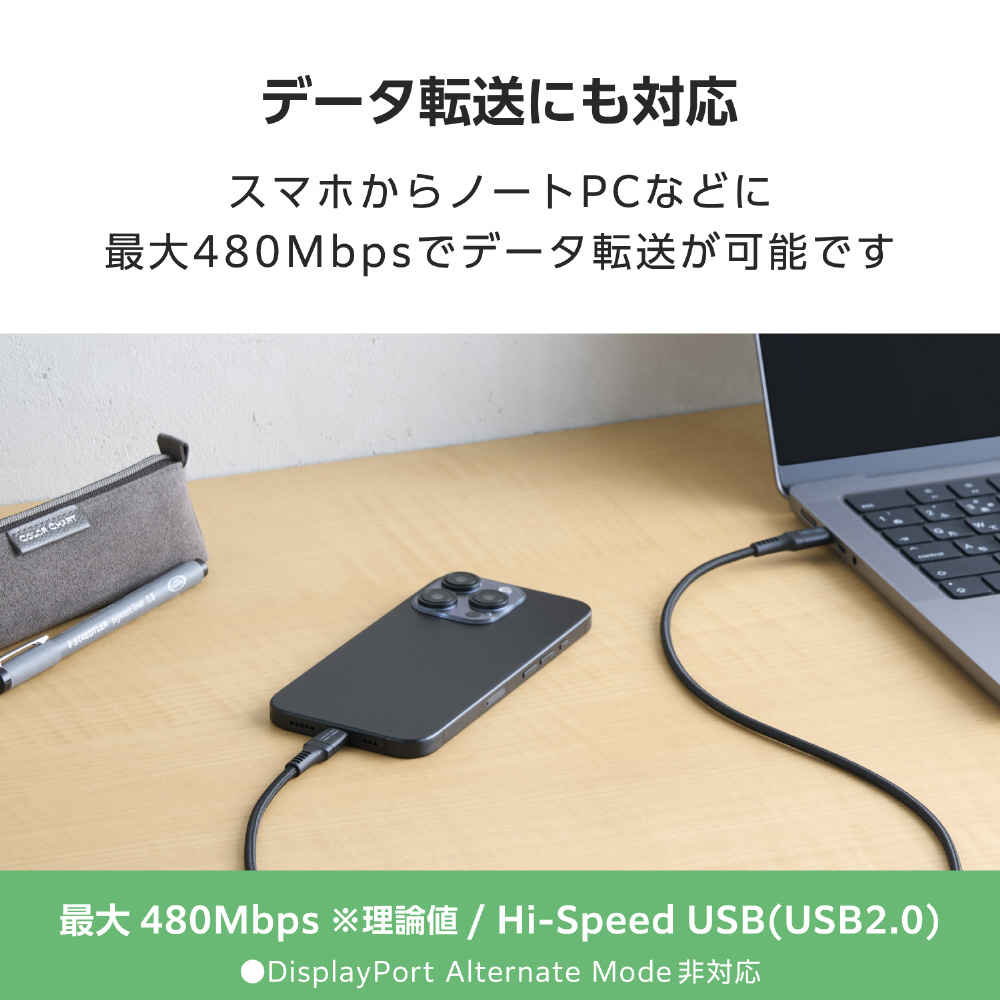 ナイロンメッシュ素材、高密度配線、ロングブッシュを採用した、断線に強い高耐久仕様のUSB Type-C(TM)ケーブルです。最大240Wのハイパワー充電で、スマートフォンやノートパソコンなどさまざまな機器への充電と、最大480Mbpsでのデータ転送が可能です。