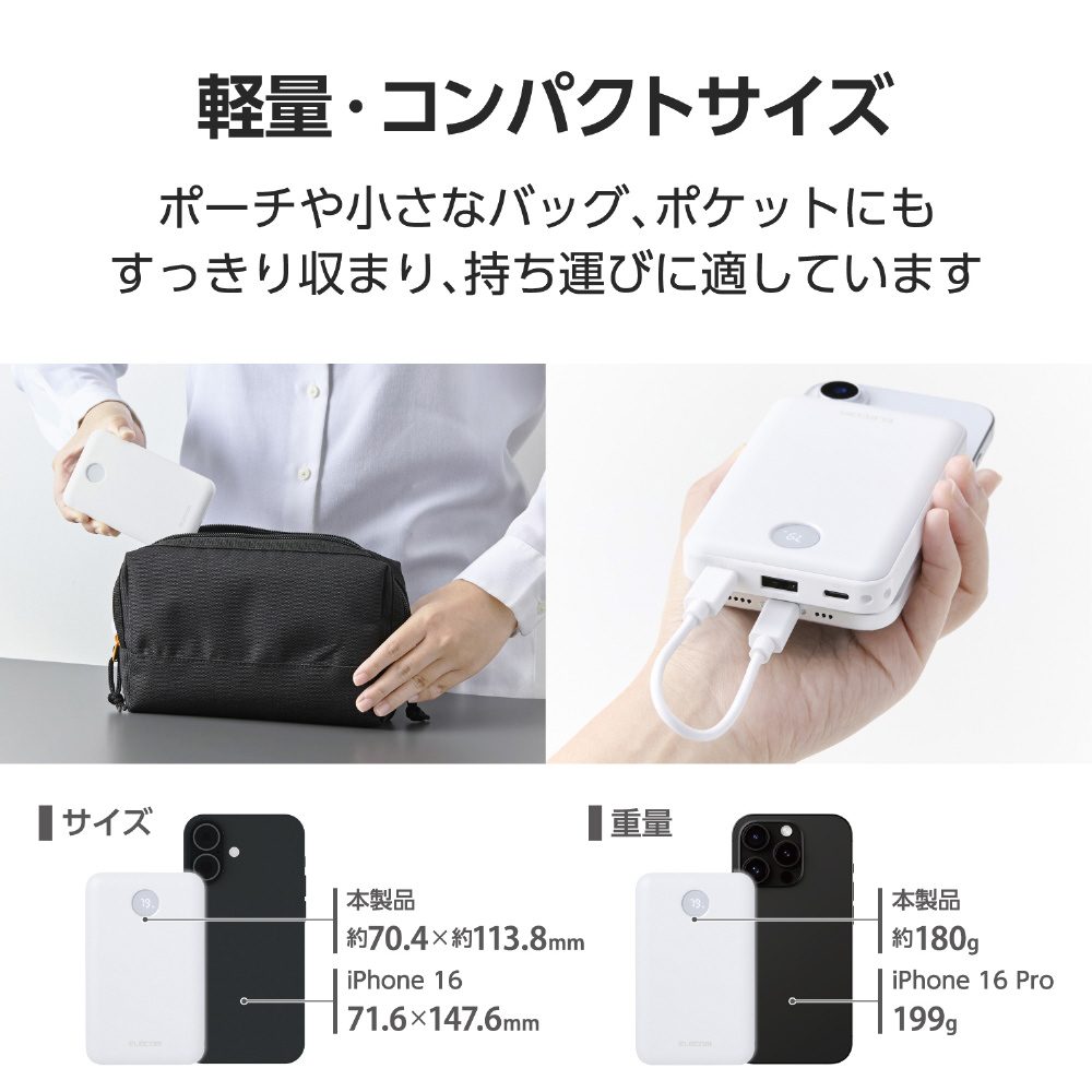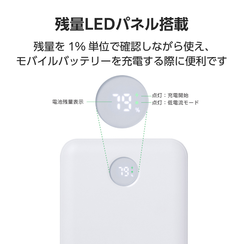 厚さ約16mmの手のひらサイズで、持ち運びに便利なモバイルバッテリーです。大容量10000mAhで、外出先でも安心して充電できます。ポーチやポケットにもすっきり収まり、手軽に持ち運び可能です。LEDパネルでバッテリー残量を1%単位で確認しながら使用できます。