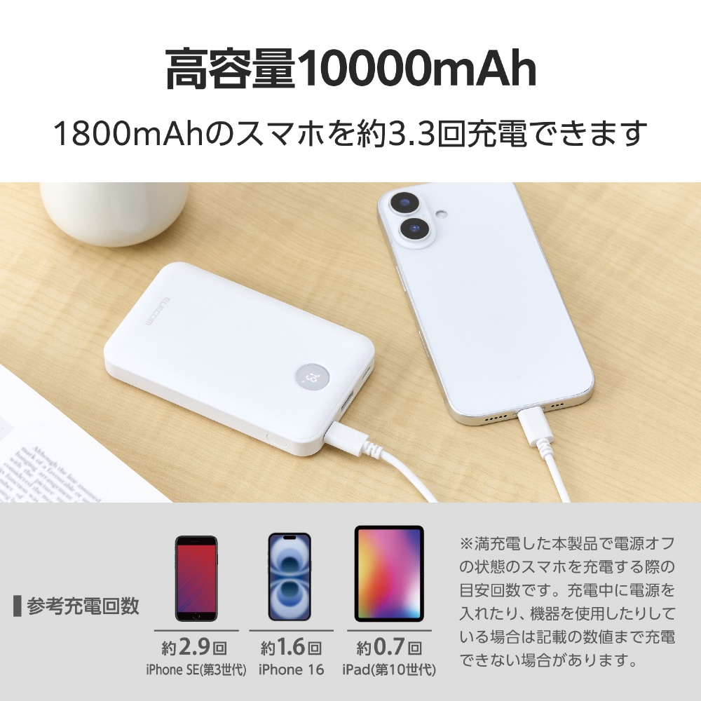 モバイルバッテリー 10000mAh 小型 軽量 22.5W充電 3ポート(Type-C×2/USB-A) 液晶残量表示 PSE適合 iPhone/Android/Switch対応 旅行 防災 ホワイト DE-C76-10000WH